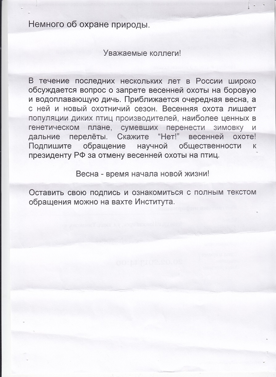Естественно я его сорвал. Сразу стало видно, что не доплачивает гринпис наши активистам зеленым, объявления приходиться печатать на черновиках. Но по обратной стороне видно кто этот спам расклеивает. Яндекс легко находит активиста http://instagram.com/p/fFBJFDBkPA/