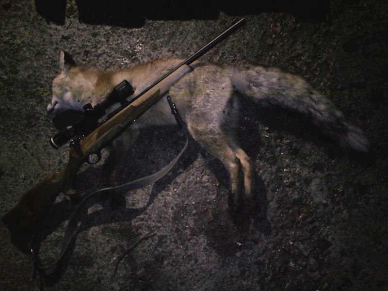 Вечер. Засидка. Товарищ с тактическим фонарём "Fenix TK-21", в помощь. Винтовка - "Соболь 22LR". Патрон - Охотник 410Э. Дистанция - 112 м. Выстрел наповал... Фото телефоном - сори.
