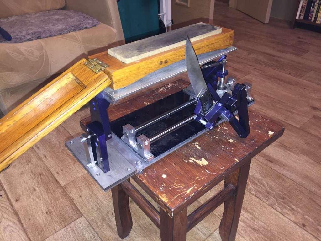 Серьезное приспособление,я при помощи дер бруска угол выдерживал,а потом вообще с руки,примерно 30 гр,а в оконцовке подвожу на пасте гое,дорогая машинка?