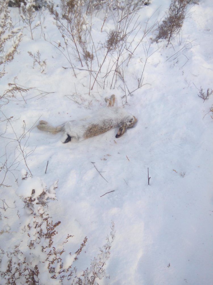 Ну вот, в этом году последний русачок. Как часто бывало, тропил один. Снега свежего не было, нашёл более-менее свежий след и быстро поднял ушастого. Вне зоны выстрела. Пришлось бросить его на обед, а потом пыхтеть за ним километра 4. Понаделал сдвоек, скидок, а лёг на ветер. Так бы мог уйти... IMG_20171228_153131.jpg