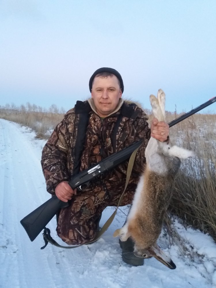 Добрый вечер. Сегодня всё таки добрал того подранка с третьего раза. С утра заскочили в одно место кое как нашли занесённые на 90% следы и в это время залп снеговой. Сунулся по следам на болото и по колено в воду ушёл. Дольше только по краю пошли и перед лэбом свежий след. На чистом месте след перемело за пять минут. Нашли выход и заяц через трассу промеж проезжающих машин. Бросили его.Следующего не смогли поднять. Третьего что раньше стрелял и с кровью ушёл, поднял случайно идя по кругу в тех местах и где то под шумел свежий след. Предупредив напарника погнал. Выйдя на болото иду потихоньку что бы не провалится и увидел силуэт, то ли пень или заяц.Стрельнул и вижу лапы откинулись. Напарнику сказал что готов. Рядом оказывается в метрах 50 ещё один лежал. Пошёл по следу второго и он по моим следам где первого стрелял идёт. Постой с пол минуты и не сходя с места можно было и второго взять. Прогнав его с км по прямой бросил.