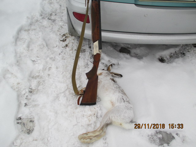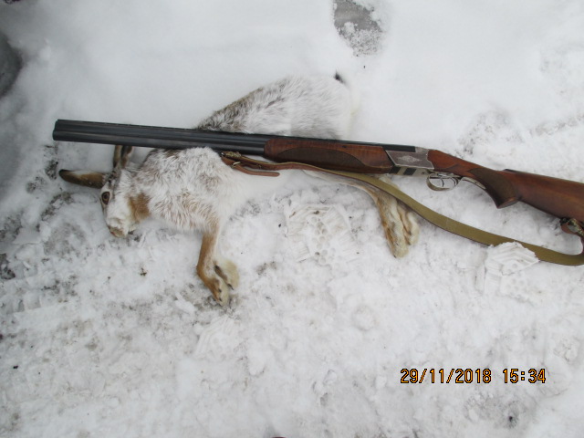 Нынче на охоте тропил одного, выскочил далековато, отстрелялся, без толку. Решил пройтись по следу, посмотреть, куда убежал, пересек лесок, заяц свернул и побежал по дороге, далее вижу двойку, поворачиваю голову, степашка выскочил слева и был взят!