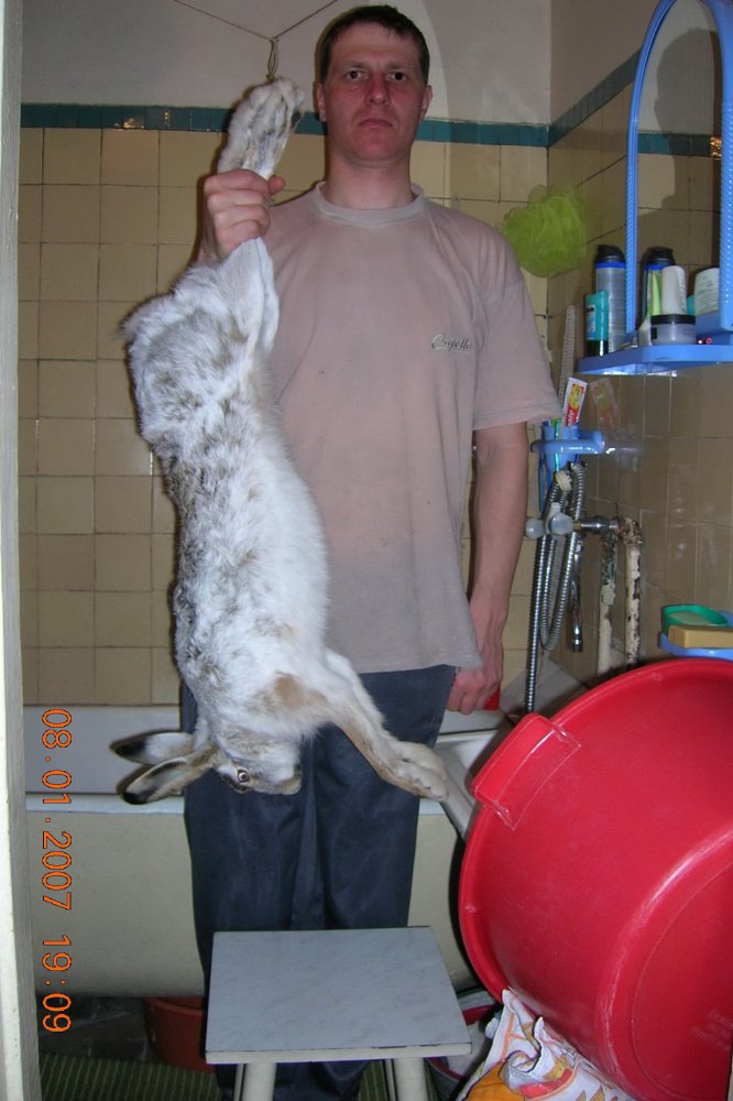 Вот самый большой русак из мною добытых. Если верить записям "самка, 5,5 кг" Смущает одно...всегда зайцев взвешивал в мясе, разделанных..че-та тогда запредельный русак получается...