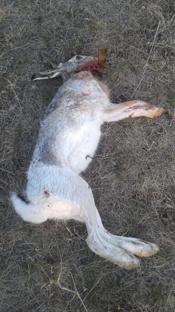 Охотился на зайца.Погода сейчас морозная.Снега нет.Приехал на ручей. Осмотрел место .Решил идти по бугру сильно заросшим ковылем.С солнечной стороны.Буквально прошел метров 50 и поднял зайца.Очень близко .Стрелял патроном двойкой с разделенным снарядом дроби на три части ,толстой картонной прокладкой .Но все равно обзадил..пришлось добирать ножом.У нас норма один заяц в день.