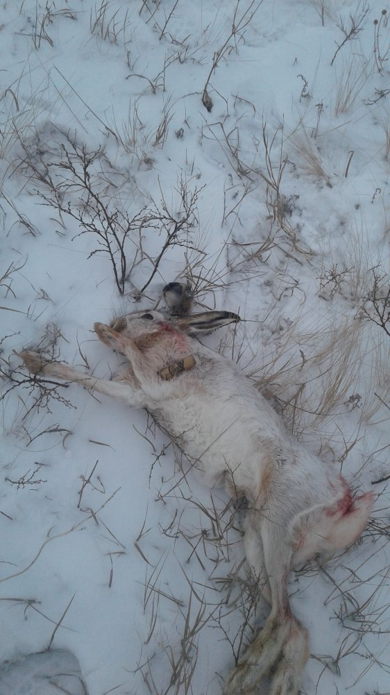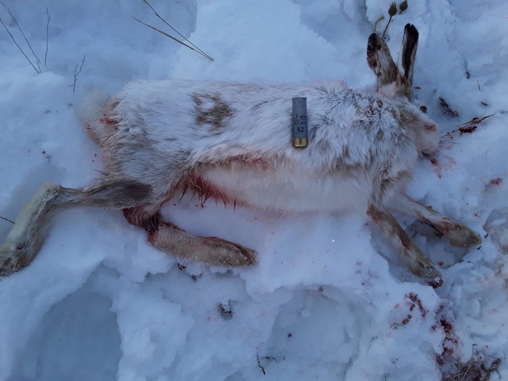 У нас тепло.Было вчера 16 мороза,сегодня 5 градусов.Снова подвалил снежок.С другом выехали на охоту.Решили походить по лощинам ,заросшими челигой.Следов было достаточно.Но не как не удавалось поднять зайца.Что то в этом году они жируют и очень далеко уходят на лежку.В пашню или семечки.Обрезали места жировок.Пробовал тропить.Но не одного зайца не поднял.Решили пройти по зарослям челиги.Подняли одного.Друг ранил зайца.Ранение было тяжелым.Кровь по обе стороны следа.Заяц пошел на пашню.Я по следу.Товарищ встал на дорогу вдоль поля.Я был уверен что заяц ляжет метров через 150. Но он уверено удалялся.Подождал немного.Заяц с поля вышел на ковыль .След хорошо было видно.Метров через 800 я увидел русака.Все брюхо у него было красным от крови.Он сделал сдвойку и присел за бугорок земли.Ветер дул на меня.До зайца оставалось метров 50.Но все думаю.Шансов у него нет.Если поднимется я его достану единичкой.Подхожу на метров 30,зайца не видно из за бугорка.Как оказалось это была лисья нора.В которую он заскочил.Заглянул в нору,за поворотом зайца не видно.Проволоке и троса как обычно у друга в машине не оказалось.После друг приехал и достал этого зайца проволокой.Но пока продолжили охоту.По оврагу с кустарниками и деревьями,двинулись дальше.Километра через два в мою сторону выскочил русак.Которого я добыл двойкой.