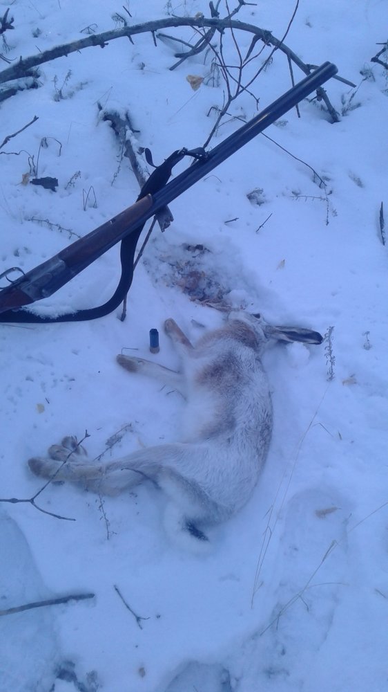Вымотал сегодня нас напарником жизнестойкий подранок. Поднялся от напарника, в чаще, в овражке. Он мог стрелять косого только теоретически. верхом выскочил на меня, перед лощиной и чуть было невредимым и не ушел. Зацепил я его вторым выстрелом. Тропя в чащах, по следу в течении часа, взять не смогли. Дали отлежаться два часа. Получилось так, что еще почти два часа я тропил косого в одного. Особенно долго разбирал следы в том месте где мы дали косому покой на время. Кропотливо, по трем секторам, отрезками, просматривал и находил крупинки стылой крови и вытеснил косого в граничащей с полем более редкий массив. Подоспел напарник и в сумерках мы косого добрали, взяв в "клещи", когда он дважды сумел оторваться от нас невидимым на просматриваемом пространстве, едва мы отвлекались смотря вперед Вот так.
