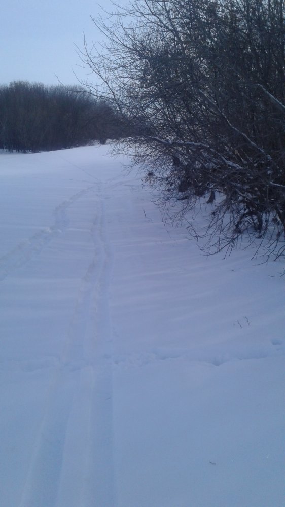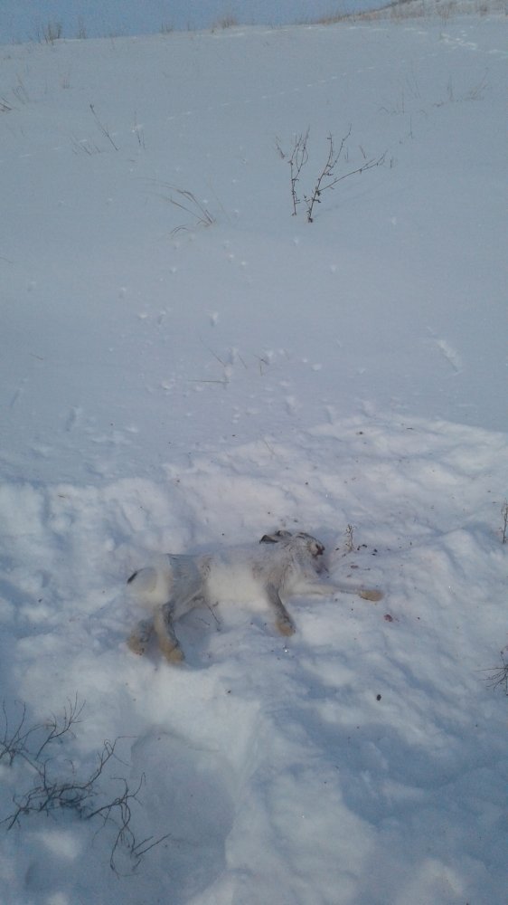 @Кандагач, отлично с Полем!. Снега у вас заметно меньше.Сегодня рановато ,где то в половине десятого выдвинулся в поля.Нужно было еще подождать с часок. Первого зайца поднял метров через 700. Но далеко метров 80 его увидел.Хотя поднялся метров 40,в зарослях чилиги сидел. .Хороший крупный русак.Пошел дальше .На возвышенности следы зайцев были,но не много.Везде следы от снегоходов.Видно стреляют зайцев.Пошел вдоль посадки ,километра через три поднял еще одного русака.Тоже далеко выскочил.Шел под ветер.Перешел поле километра два и пошел назад по посадке.Следов практически не было.Снега много посадка низкая.В основном карагач.Зайцем видимо не нравилось в этом месте.Сильно продувало ветром .Потом спустился в лощину с чилигой.Зайцы жировали в низине.Но все ушли на холмы ,где следы задуло.Ходить на лыжах хорошо.Наст отлично держит.Решил спуститься в низ к реке.В этом месте давно не охотился.Пройдя с километр нашел ночной след,он шел краем реки.Потом вижу сдвойка.След уходил в колки.Начал потихоньку двигаться.Прошел метров 20 ,вижу русак спрыгнул в сторону реки.Практически напротив меня.Тут я понял он лежит рядом.Берег заросший кустами ивы. И точно через пару шагов заяц поднялся в кустах,метров в шести от меня.Немного сзади.Вскидываюсь.Но русак не стал перебегать реку,а сразу прижался к берегу и побежал по льду..Шансов выстрелить не было.Разворачиваюсь по ходу движения русака.И вижу что он снова выскочил на этот берег и поднимается на холм.Бежал он не быстро.Расстояние метров 50.Вскидываю ружье,стреляю нулем.Заяц падает.Барахтается в снегу. Дробь легла отлично.Вижу попадание в голову.Добрал русака.И пошел в сторону дома.