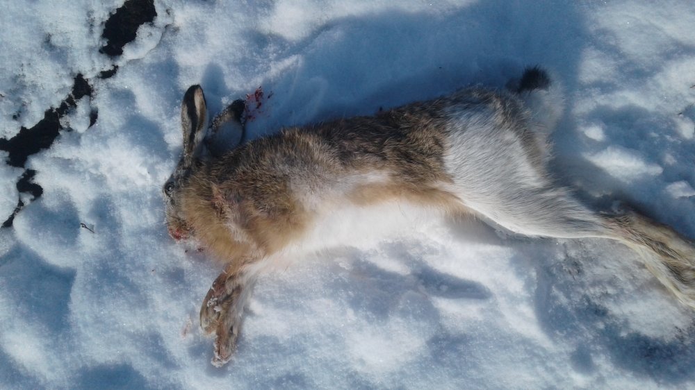 И у нас выпал снег. С утра выехал на охоту. Первый след нашёл быстро. Первая скидка в ковыл...сердце учащено забилось ) Прошёл метров 600 ,след уходил в лощину. Но заяц как оказалось лежал сверху этой лощины. Он увидел меня. Позицию выбрал удачно. Поднялся метров за 200 .Лежал в лисей норе на входе. Но первый блин комом ) Второго не смог перевидеть в ковыле. Сильно он там напутал. Нашёл третий след. Он шел по краю оврага. Скидка в этот овраг с челигой. Я начал спускаться. Вижу сдвойку по кустам челиги. След не читался. Просто провалы