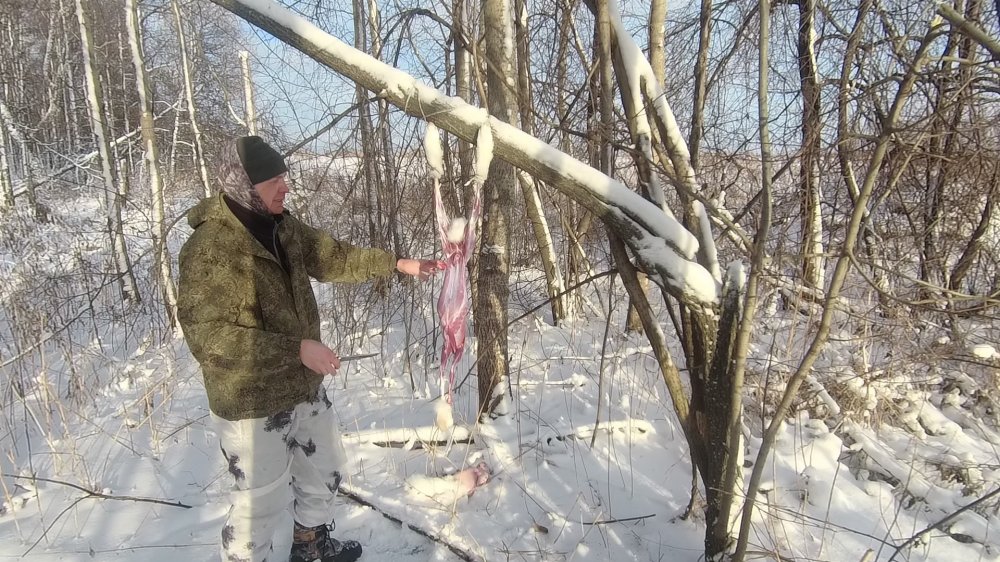 Оставил его там же с рюкзаком, сходил до машины (благо всего метров 30) взял воду и контейнер под мясо, там же в болотинке его и раздел.