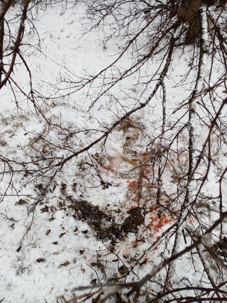 Сегодня с утра капал дождик,но рванул в поля в одного и не прогадал :Dснежку сыпнуло миллиметры,хватило чтоб присыпать старые следики.Свежий след увидел прям на дороге,бросил посреди поля машину,зарядился единичной и по следу.След оказался ведущим с жировки и примерно через километр привел в небольшую лощину с травкой и кочками по щиколотку.Решил до скидки не идти,а со следа вышел прям к травке,да с подветренной стороны заяц такой пакости от меня видать не ожидал и поднялся из под кочки метров на 30 ,взял с первого выстрела.Пробовал тропить ещё одного,но тот матёрый,поднялся метров на 100,дождик и тепло снег съедают на глазах:-\фото только такое получилось,русак молодой,не вылинявший :-\ IMG-20231127-WA0058.jpg