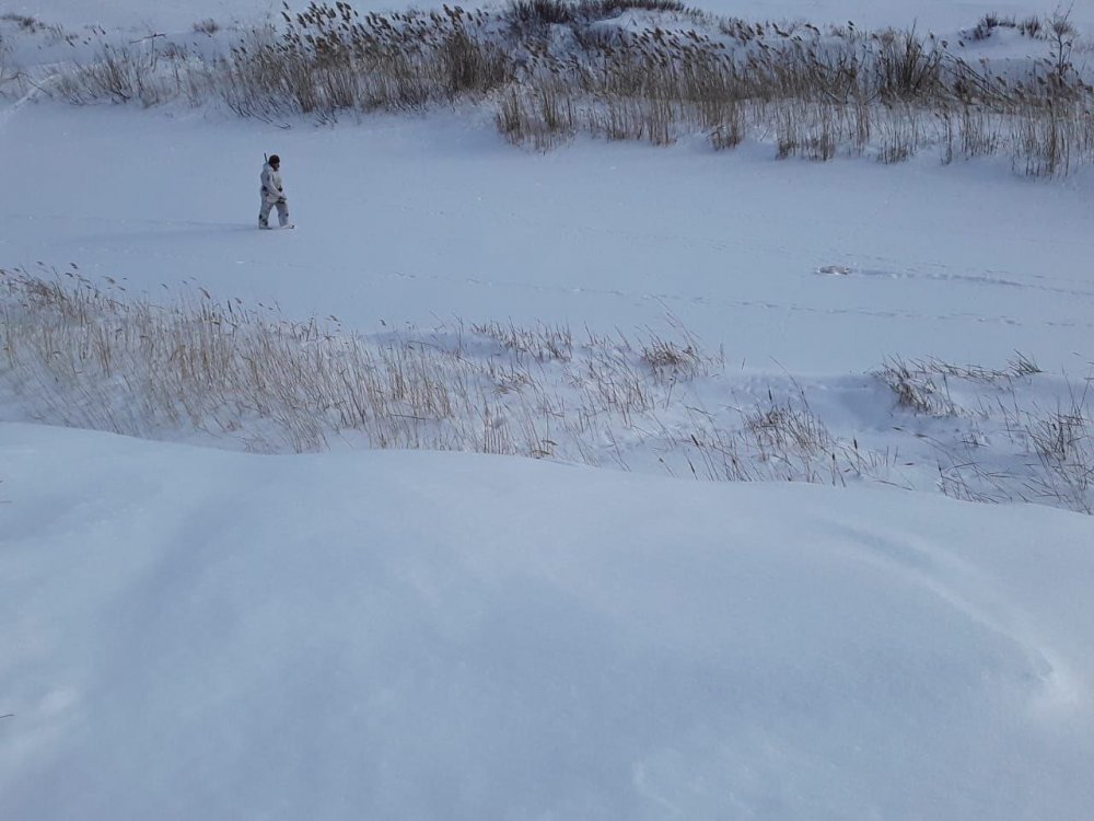 В субботу на выезде по косым выпал у меня курьезный случай, о чем хочу поделиться, будучи наказан за излишнюю самонадеянность. Резкий пронзительный ветер с морозом погнал нас к речке, где потише. Юру высадили на грейдере и пока он шел по балке к речке, мы с Нурлыбеком вышли на перехват. При этом я быстро проскочил верхом, опережая Нурлыбека, идущего вдоль камыша. Еще не встал у открытого плеса, как по льду понесся матерый косой, ближе к противоположному от меня берегу, на приличном расстоянии. Бью его четырьмя нолями, 1991 года рождения, в черном пластике из серии доставшегося мне по случаю десятка. Пашет снег, отлеживается. Затем ползет в прогал между камышем и там сидит прижав уши. Все время держу на мушке, почему то размышляя - добивать или нет? С одной стороны шпиговать крупняком не охота, а тройкой уже не возьмешь... Снег в камыше глубокий - в крайнем прочешем и доберем. Далеко не пробьется... С тем ствол и отпустил, когда Юра уже был на подходе и мои сомнения видел со стороны. Теперь спустился и пошел за косым. В этот момент от Нурлыбека поднялся и понесся мне навстречу еще один косой. Бью его в штык опять же, нолями. Добираю и передаю подошедшему Нурлыбеку. Юра кричит, что косой поднялся из камыша наверх и умчался по речке. Как так? Пошли, отправив Нурлыбека на номер. Мне не верится, что это битый мною косой. Возвращаемся с Юрой назад и смотрим след. Увы, косой оклемался от контузии, когда все лапы и кости целы, а раз крови нет, то и мышцы целы и ускакал вполне здоровый... Мимо Нурлыбека проскочил другой косой и дальше я взял другого косого, но это другая история, другой охотничий фарт, описанный в отчете. Все в принципе сложилось удачно, но факты вещь упрямая - это излишняя самонадеянность.