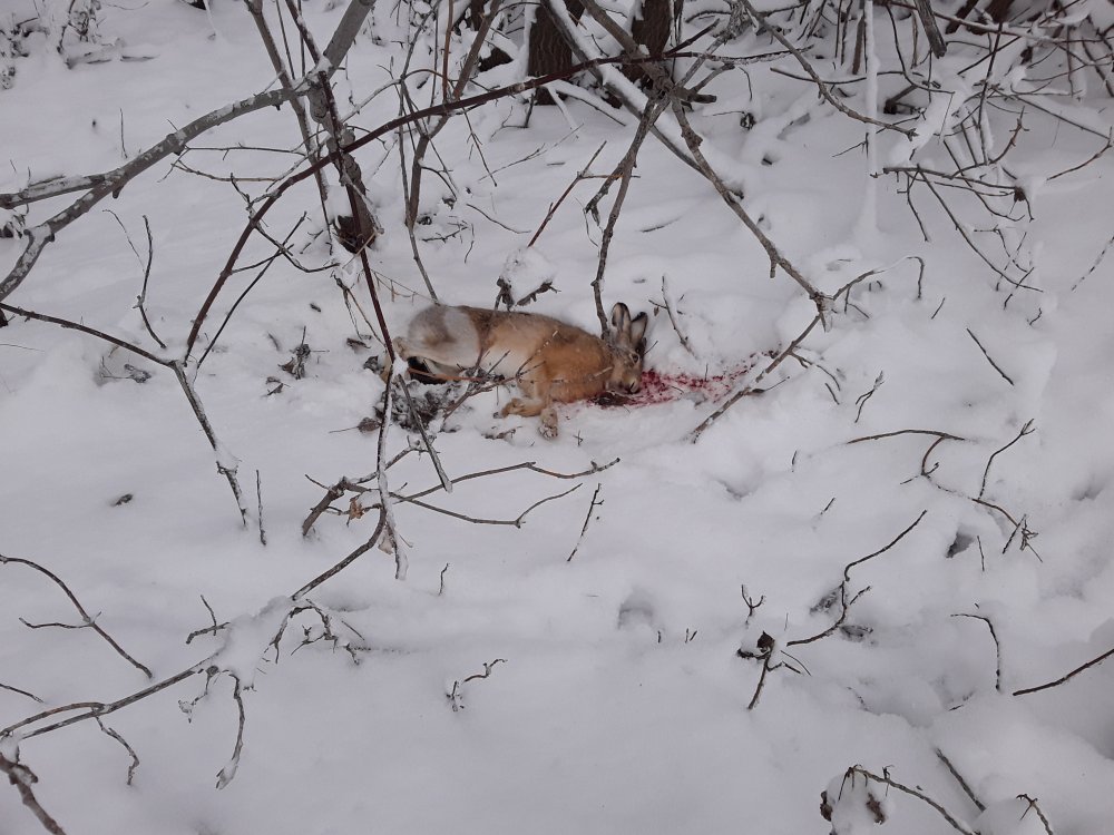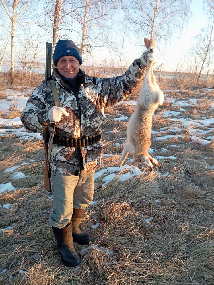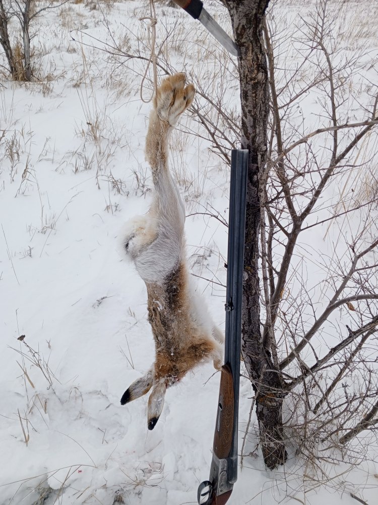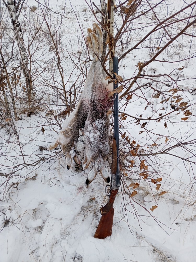 Ночью немного снежка подсыпало.Тепло,ветра не было.Отличная погода для охоты на зайцев.Зайцы ночью наследили.Не стал особо разбирать следы,посмотрел перспективные места для дневок и начал обходить.В одном месте на краю оврага полянка не выкошенной травы.Русак поднялся близко из травы,отпустил метров на 25 на скошенное.Стреляю единичкой 28 грамм.Русак прыгает в овраг.Ну думаю,наверное лежит на дне оврага.Посмотрел на след от дробовой осыпи,дробь легла отлично.Спустился по следу в овраг,Зайца нет.Хороший беговой след,ни кровинки.Подождал немного,что бы заяц остановился.След уходил на холм заросший чилигой и ковылем.Метров через 700 ,русак запал в ковыле,нашел лежку.Со всех сторон кровь,на снегу.До этого места не капли крови не было.Впереди была дорога,я был уверен заяц пойдет по ней по кругу.Так и получилось.По дороге след от кировца.С одной стороны пашня,с другой ковыль,чипыжник.Но думаю на пашню не должен пойти,сделает сдвойку и прыгнет на ковыль.Метров через 200 смотрю скидка с дороги .Но это другой заяц.Но думаю все равно нужно выждать ,начал тропить.След уже был немного задутый снегом.Поднял русака в чилиге.Добыл единичкой,тоже пришлось отпустить.Вышел обратно на дорогу,нашел скидку подранка.Он поднялся далековато метров за сорок.Но в любом случае нужно было стрелять.Добыл красиво с первого выстрела единичкой.Русак зарылся в снег.Потом когда его разделывал,весь зад был раздроблен.Но по следу не капли крови и нормальные большие прыжки как будно и не подранок.Поэтому не люблю стрелять в угон русаков,лучше когда под углом,но не всегда так получается.