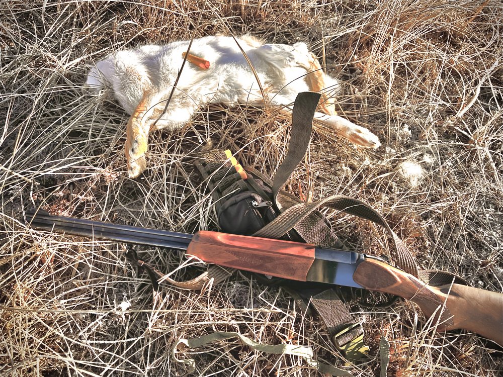 Третьего зайца я взял в лесополосе, вскочил в метре от меня из-за дерева, ну я и бахнул его не думая. В зайце дыра 3 см, зато тушка целая. Ходить без лыж тяжело по краям колков, от вышеколена до кокушек.