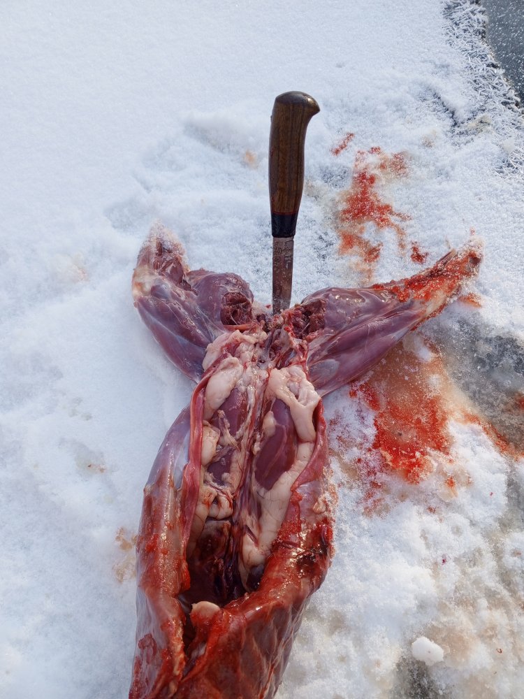 Когда разделывал оказалось—дробина прошила задние окорочка, другая зацепила середину хребта, прошиты лопатки, левая лапа перебита до сустава, на пясти.