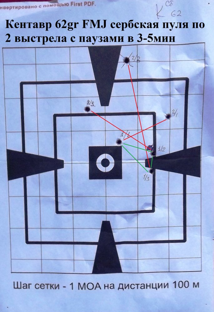 Далее я все таки решил стрелять парами Кентавром 62gr сербскими пулями. Если наши так полетели, то на эти я понадеялся ооочень в лучшую сторону. Хрен его знает, может уже набегался к мишеням, хоть и отдыхал подолгу, но возможно чуть и задолбался, был бы помощник у мишеней, было бы проще. Супруга у мишеней отказалась стоять, сказала, что подавится шашлыком при выстреле. А может все таки не такие уж они и гуд (не шашлыки, а патроны). На ФОТО 3 видно, что не лучше более легких и наших. Линии красным от каждого первого ко второму, а зеленый треугольник это все первые выстрелы..Второй выстрел в третьей паре - на 90% это уже я сам дернул. Ну а ФОТО 4 это я выстрелил быстро этим же Кентавром сербом 62gr. Ну не так быстро, что не целясь, целился старательно, но не остывал ствол.