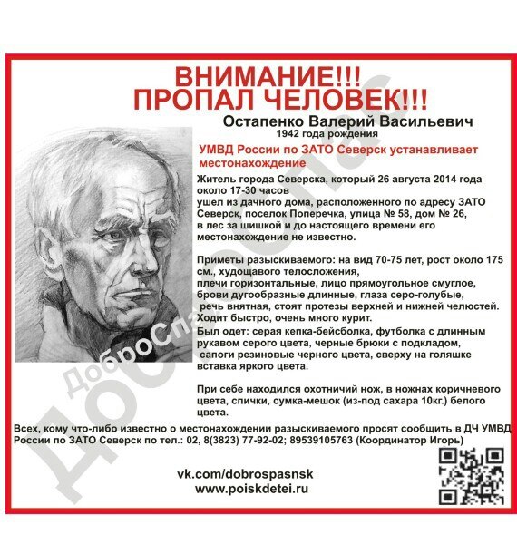 В городе Северске идет активный поиск Остапенко Валерия Васильевича, 1942 года рождения, жителя города Северска, который 26 августа 2014 года около 17-30 часов ушел из дачного дома, расположенного по адресу ЗАТО Северск, поселок Поперечка, улица № 58, дом № 26, в лес за шишкой и до настоящего времени его местонахождение не известно. Приметы разыскиваемого: на вид 70-75 лет, рост около 175 см., худощавого телосложения, плечи горизонтальные, лицо прямоугольное смуглое, брови дугообразные длинные, глаза серо-голубые, речь внятная, стоят протезы верхней и нижней челюстей. Ходит быстро, очень много курит. Был одет: серая кепка-бейсболка, футболка с длинным рукавом серого цвета, черные брюки с подкладом, сапоги резиновые черного цвета, сверху на голяшке вставка яркого цвета. При себе находился охотничий нож, в ножнах коричневого цвета, спички, сумка-мешок (из-под сахара 10кг.) белого цвета. ОЧЕНЬ НУЖДАЕМСЯ В ПОМОЩИ ОХОТНИКОВ И ВОДИТЕЛЯХ ВНЕДОРОЖНИКОВ, ГОТОВЫХ ВЫЕХАТЬ НА МЕСТО ПОИСКА! Кто может оказать в помощи поиска- не оставайтесь в стороне, пожалуйста! Штаб передвигается с места на места, поэтому выезжающим просьба звонить координатору поиска Игорю +79539105763 Мы ждем помощи не только от жителей города Северска, но и от других близ лежащих городах.