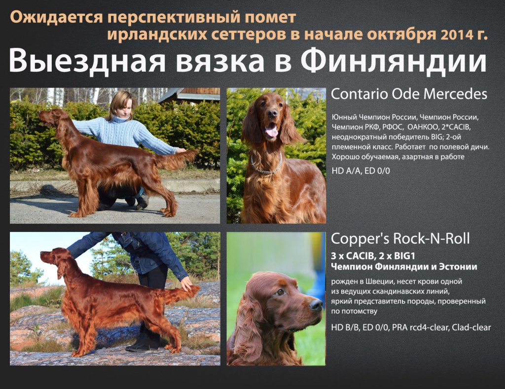 Ничего личного, вязка интересная для тех, кто знает зарубежные линии ирландцев, но вводит в некоторое недоумение примитивность (уж простите за термин) рекламы. Не на "эксклюзивность" кровей надо акцентировать внимание, а на личных качествах и достижениях родителей, их общих или индивидуальных достоинствах, которые заводчики хотят культивировать - увидеть в потомках.