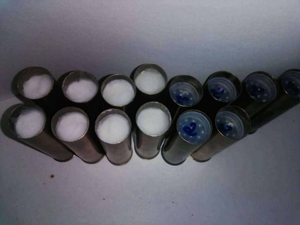 Сегодня по снаряжал пулевых патронов на этом самом порохе: Крупный, очень крупный: Сыпал 4,2 грамма/ 2пороховых прокладки 16 калибра/ 2 ДВП пыжа 16 калибра/ прокладка/ пуля шар Ф15мм. весом 19,5 грамм на ватный диск/ заливка парафином для надёжности.