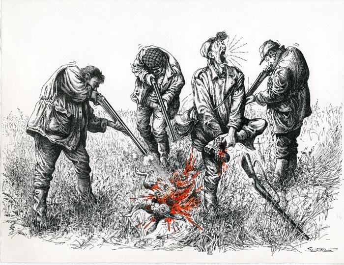 Судя по натуре, всё из жизни. Та что про закос под оленя нравится больше всего. Судя по расцветки камуфляжа, бойцы вероятного противника. А это значит, что и в случае чего, не дай Бог конечно, не изменим своей охотничьей страсти.