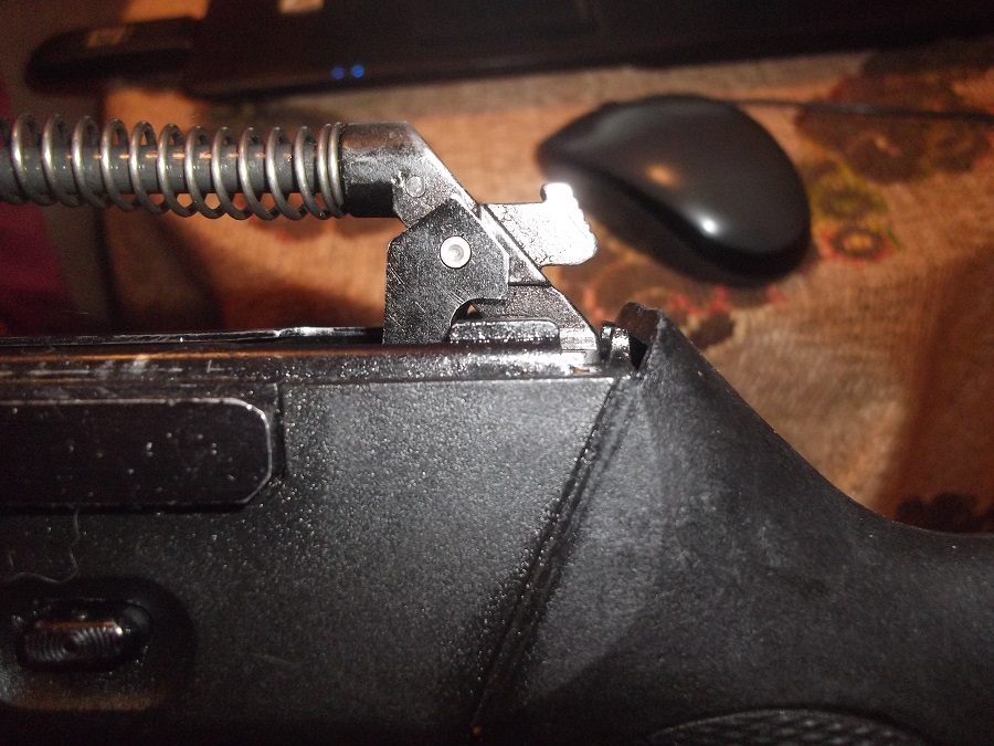 Николай! Попробую объяснить возникшую версию: приблуда болтается на упоре пружины и при этом заклепка работает как ось вращения. Если при этом приблуда не будет прижиматься равномерно всей плоскостью к основанию коробки а только верхней частью то получится рычаг. Затворная рама при отходе назад будет упираться в нижнюю часть приблуды, она в свою очередь прижимаясь к основанию коробки через точку опоры вверху будет двигать "кнопку" вперед.
