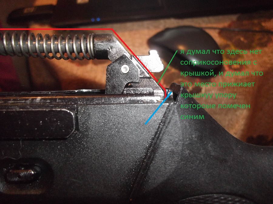 Эта приблудка действует как прижим бОльшей плоскостью затворной рамы по низу. То есть без неё был бы удар затворной рамы по верхней части возвратной пружины и пазы по которым ходит возвратная пружина разбивались бы. Получается, что этим как раз еще сильнее и равномернее прижимается всё к тыльной части и упору, который Миша пометил синим, а следовательно сильнее прижимает крышку к этому упору. Но мне как то подозрителен зазор на Мишиной фотке в ответе №216 я скопировал это фото и указываю вопросительным знаком, сравни с моими фотками там вообще плотненько в этом месте.