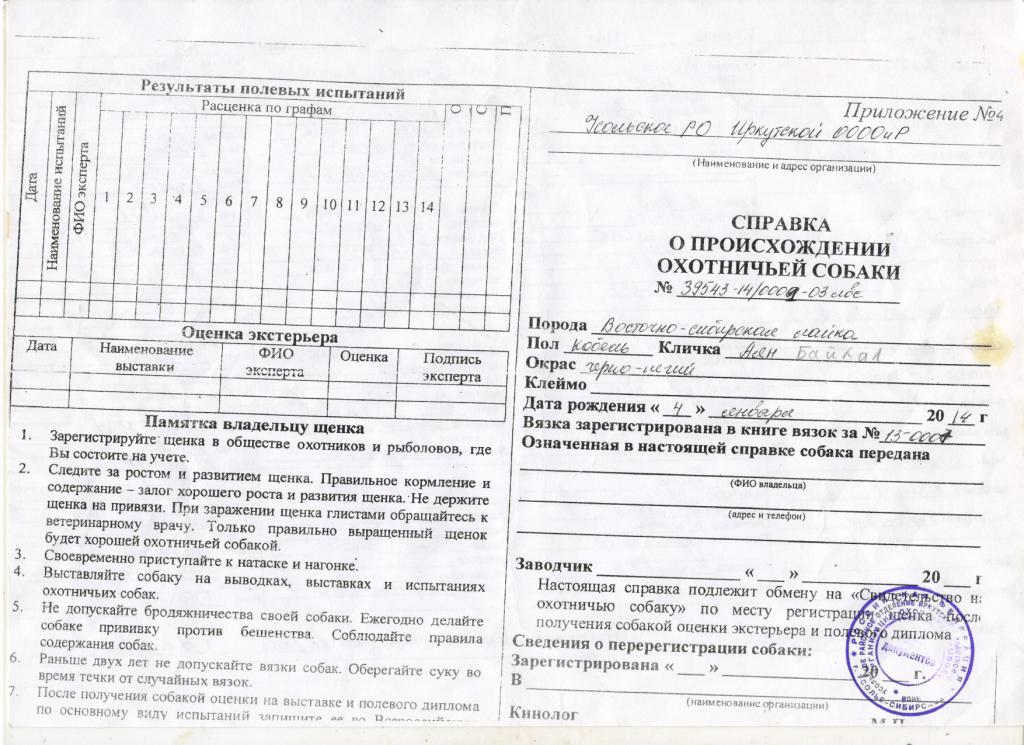 Добрый вечер, Татьяна! Скан родословной выложу только завтра, т.к. она у отца. Скажу только, что кобель рожден от суки по кличке Айна (владелец Чулков) и кобеля по кличка Тишка (владелец Костровский). На сколько я помню, в крови Тишки есть одна из Ваших собак - сука по кличке то ли Чага, то ли Гага (не разборчиво написано, ВПКОС 1514 | 03 владелец Десятов С.В.).