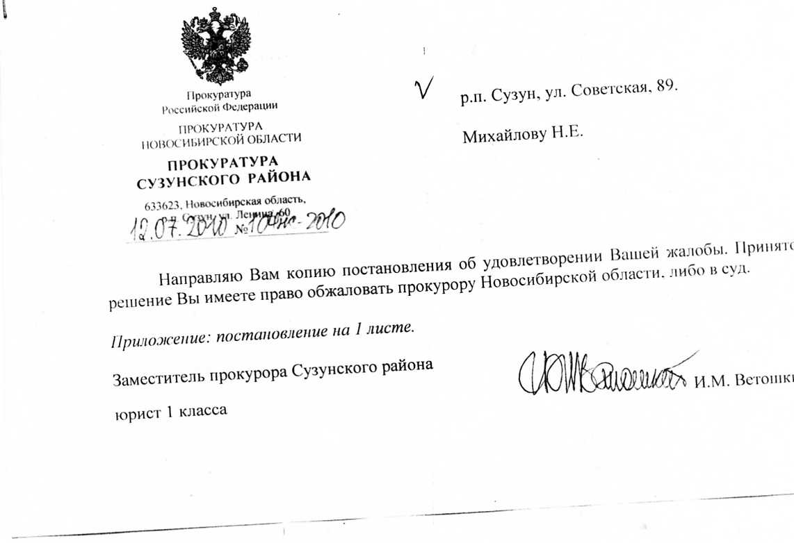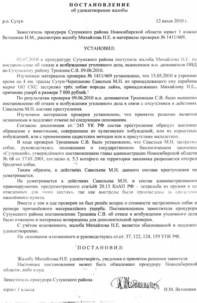 Нашлись документы четырёхлетней давности (к сожалению, давность истекла) по всё тому же инспектору Савельеву. Была попытка взять его за жабры. Не хватило упорства заявителю. Плюнул, после второго отказа в возбуждении. Хотя, первый отказной прокурор отменил, но был сделан второй отказ, под копирку с первого. Я тут пристегнул документы. Даже в сухих документальных строчках видна безмерная вседозволенность и безнаказанность. Коротко суть дела : Житель Сузуна прогуливал суку ЗСЛ с двумя щенками в районе песчаного карьера под Сузуном (4км). Савельев застрелил суку и обоих щенков в пяти метрах от асфальта трассы Сузун-Черепаново. Отказано в возбуждении "За малозначительностью ущерба". Нашли где-то справку с Кубовой, что сука стоит 7 тысяч, а про щенков даже и не вспомнили. 7 тысяч - незначительный ущерб. Какие у них зарплаты? Это при том, что в 10-м годе по УПК 2500 ущерб государству считался значительным, а для гражданина - любой, хоть 100 рублей...
