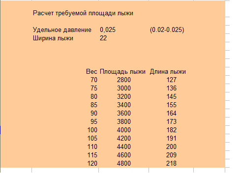 А так нужно соотношение вес/площадь лыжи в кв.см не более 0.025, тогда будешь спокойно ходить, вес надо брать с запасом, т.к. одежда, снаряга, оружие, добыча вес добавляет. Я пару зим ходил на своих лыжах 175х15, вот где горя хапнул, в околках выше колена валюсь, вес 85кг без одежды, но коэф. получается 0.035 в этими лыжами. Потом купил себе 20Х180 понял какое удовольствие ходить по снегу :)