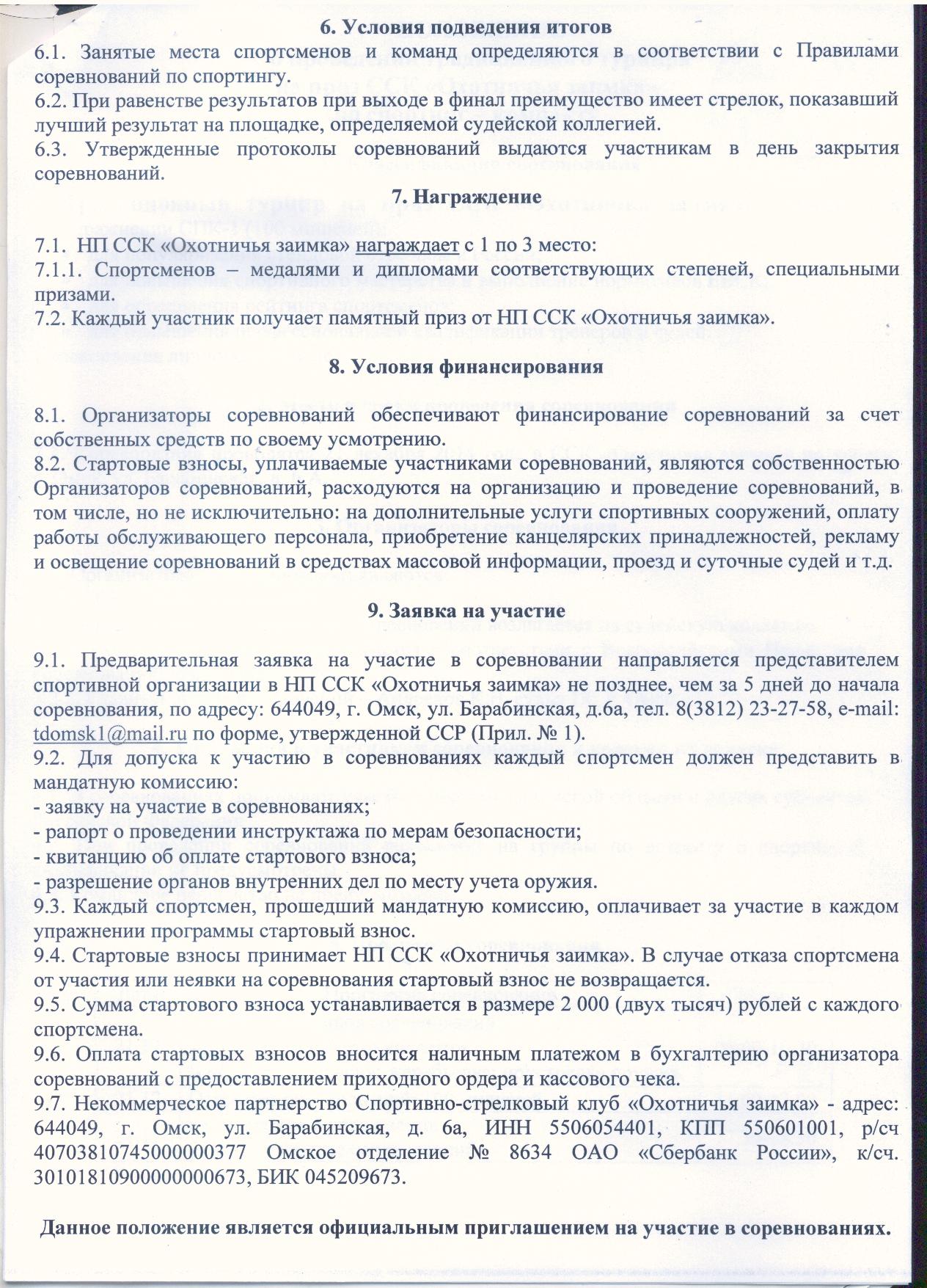 9.7. Некоммерческое партнерство Спортивно-стрелковый клуб «Охотничья заимка» - адрес: 644049, г. Омск, ул. Барабинская, д. 6а, ИНН 5506054401, КПП 550601001, р/сч 40703810745000000377 Омское отделение № 8634 ОАО «Сбербанк России», к/сч. 30101810900000000673, БИК 045209673.
