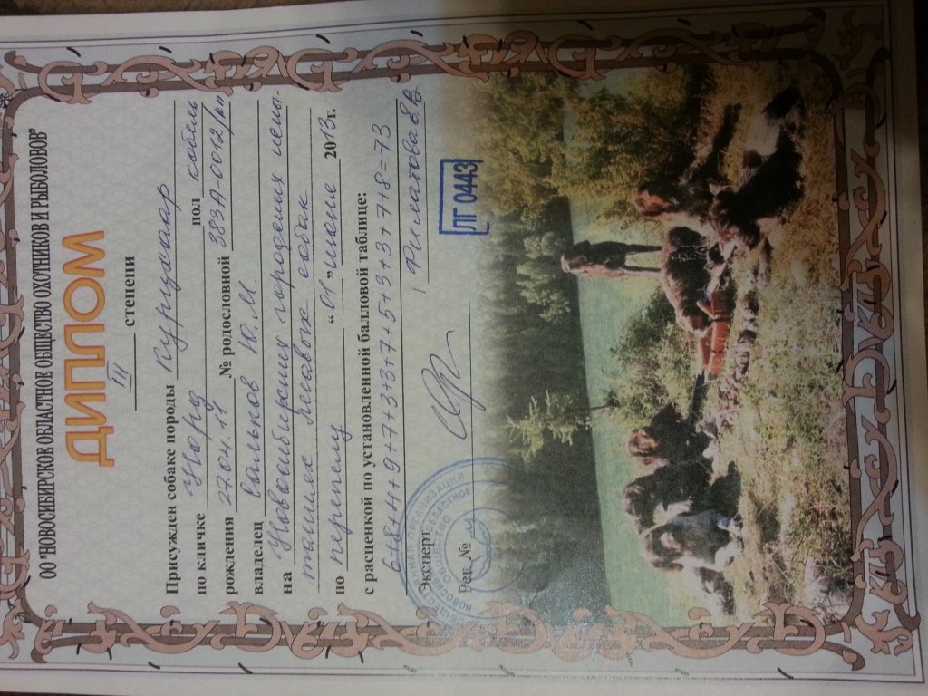 Полевые дипломы: В испытании по перепелу диплом III степени.