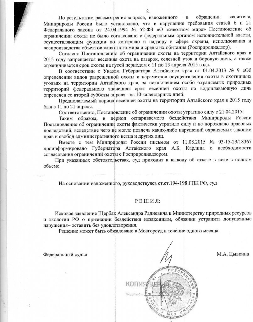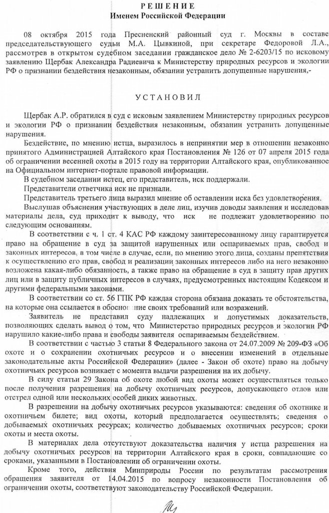 Нормально. В кратце-в иске отказано, но... есть варианты и их использую вот буквально сейчас. Найден надлежащий истец (не я) и от его имени будет подан новый иск с теми же требованиями. Процесс продолжается и итоги подведем весной по факту открытия весенней охоты в Алтайском крае 2016 :beer: