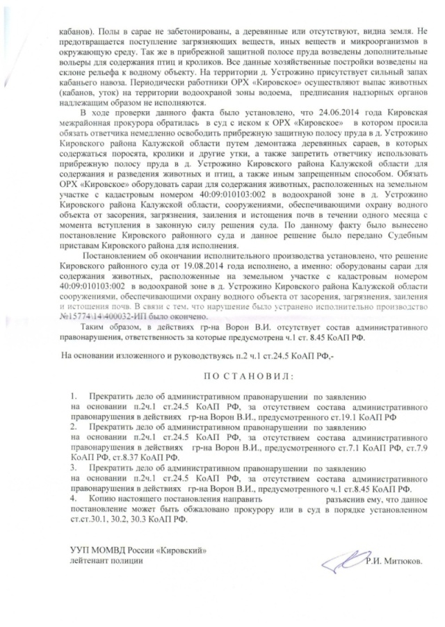 2015 начальником отдела государственного контроля и надзора за соблюдением законодательства министерства сельского хозяйства Калужской области было вынесено постановление о прекращении по делу об административном правонарушении, возбужденному в отношении меня по ч. 1 ст. 8.37 КоАП РФ в связи с тем, что протокол об административном правонарушении составлен не уполномоченным на это сотрудником полиции. Данное постановление вступает в силу в соответствии со ст. 31.1 КоАП РФ и может быть обжаловано лицами, указанными в ст. 25.1-25.5.1 КоАП РФ, вышестоящему должностному лицу или в судебном порядке в течение 10 дней после получения копи постановления.