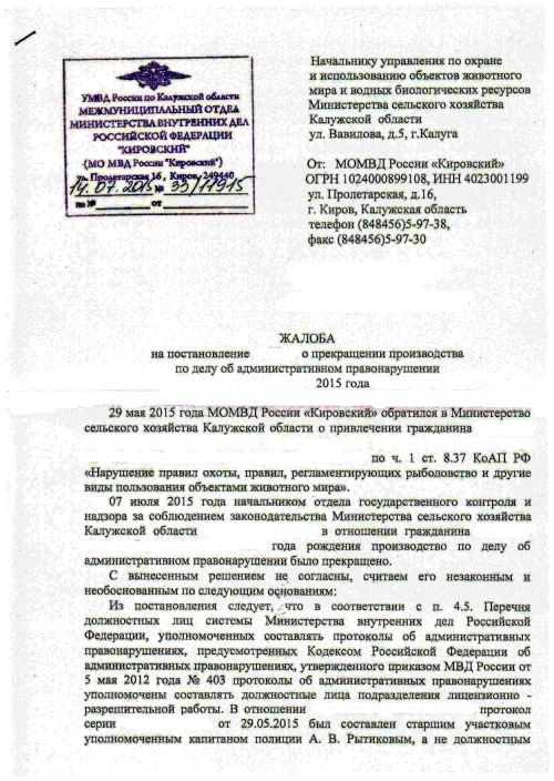 Менты написали жалобу в министерство сельского хозяйства. Интересно они знают что нарушают ст. 30.1 КоАП РФ менты не могут обжаловать постановление должностного лица, только судьи.