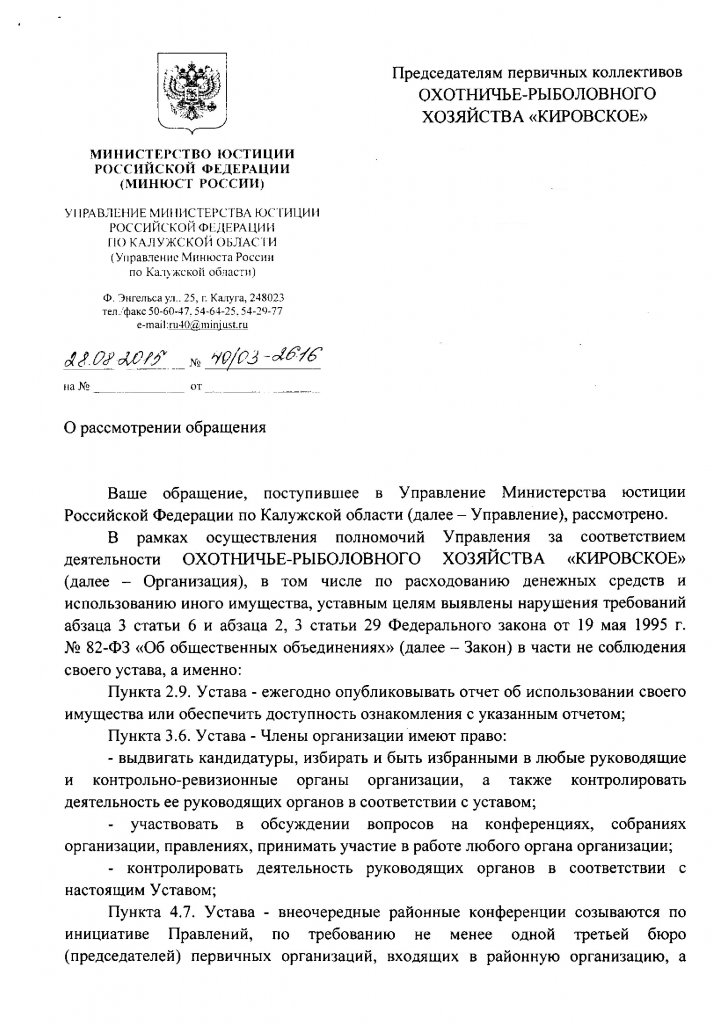 Прислали ответ из Министерства юстиции Калужской области. Ворон бегает по кабинету и кричит "Вы меня все равно не уберете, меня Калуга назначила".