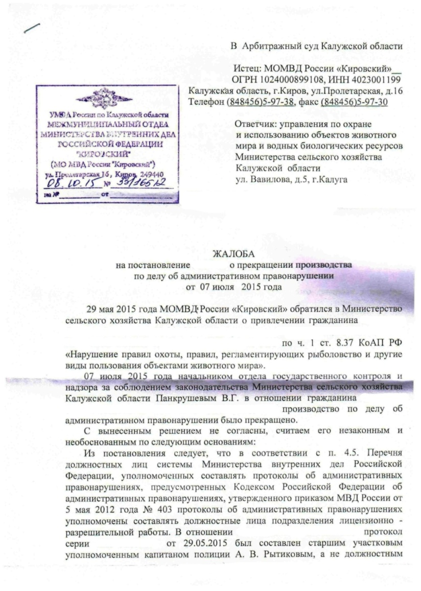 Менты написали жалобу на постановление в арбитражный суд Калужской области
