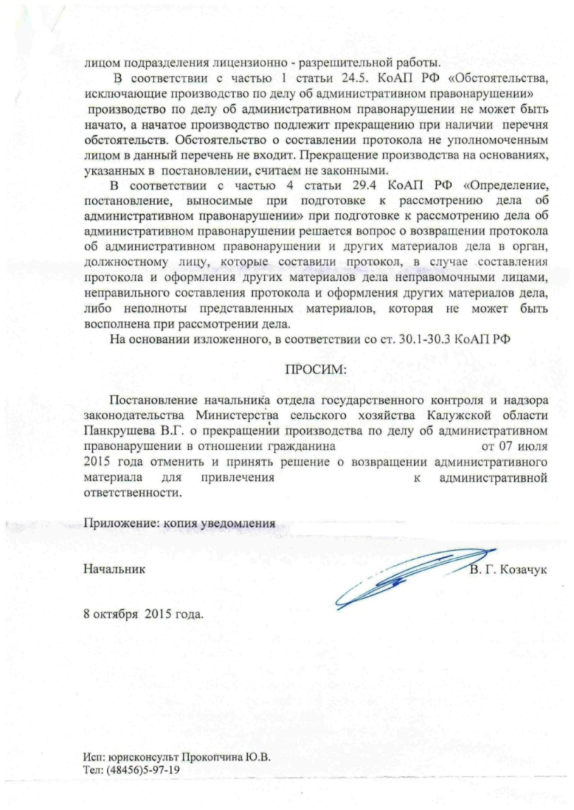 Ввиду изложенного выше прошу принять меры прокурорского реагирования, направленные на устранение указанных выше грубых нарушений действующего законодательства со стороны ООО «Игнатовское», ООО «Кудеяр», ООО «Дулево» и их пресечение в будущем. Привлечь виновных лиц к административной ответственности за нарушение действующего законодательства.