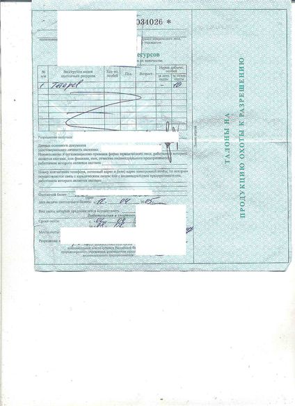 sib-hunter, вопрос лично к Вам. А как бы Вы отрезали купоны, если (как в моем случае) путевка куплена на 10 голов, к ней выдали одно разрешение (лицензию), т.е. ОДИН ЛИСТОК, в котором написано: "10 голов". А купонов в разрешении всего-то ВОСЕМЬ! А надо еще дырочки вырезать, в соответствии с днями и месяцами добычи.