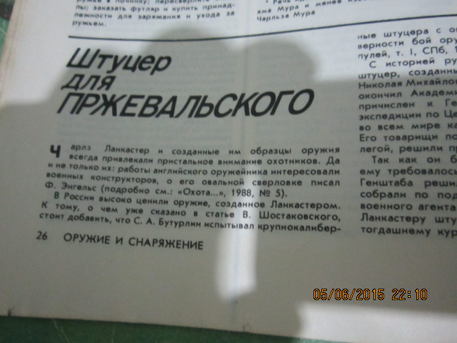Поскольку открытая тема называется "Штуцер Н. М. Пржевальского", думаю здесь можно разместить информацию, касающуюся оружия, которым владел великий путешественник и натуралист. В теме "Утятница" я писал, что друзья подарили ему ружье 4 калибра знаменитого мастера Гоно. Нашел эту статью в журнале "Охота и охотничье хозяйство" номер 5-6 за 1993 год.