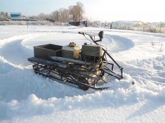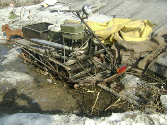 Двигатель мотоколяска СЗД,гусеница-траки ПНД на цепях.Проходимость любой снег,расход 10-15л на100км.Принудительное охлаждение,электростартер,автомобильный генератор.Задней нет.Цена 15т.руб.Тел.891371148два-девять.