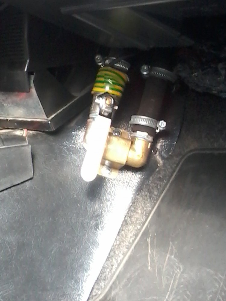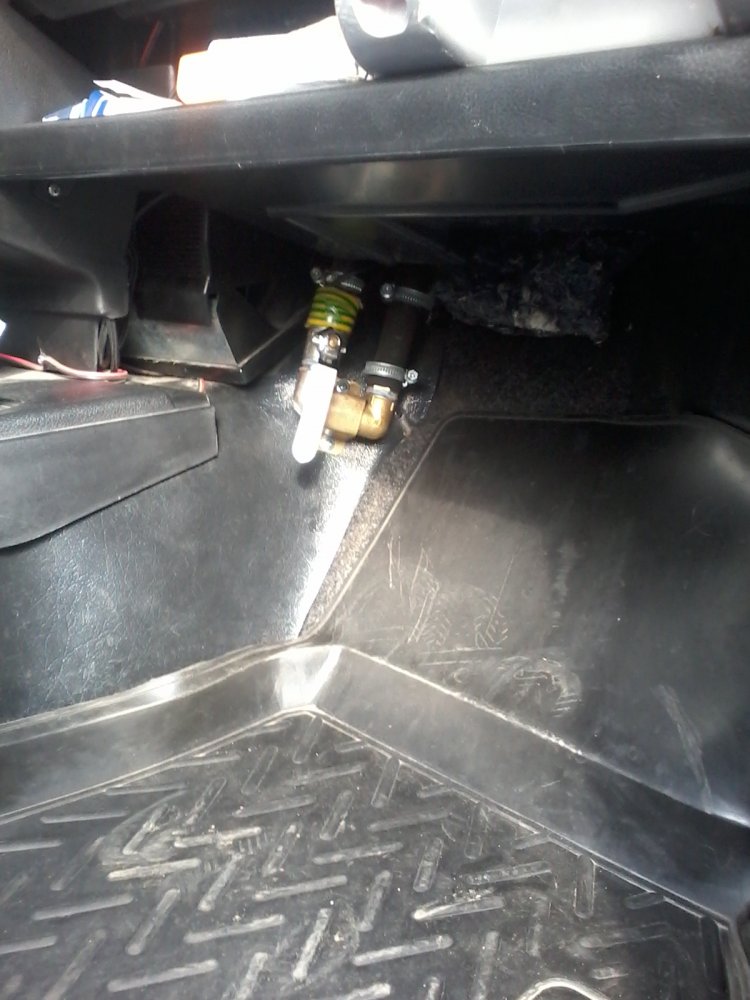 На фото должно быть понятно место установки крана. На прямую подачу поставил шланг на 90*. Он опускается вниз, на кран, Набор уголков, штуцеров и прямым шлангом на печку. Но входной штуцер печки изменил. Он должен смотреть вниз, на кран. Обратку из радиатора отопителя не трогал. Даже с ремнем безопасности легко регулирую подачу.