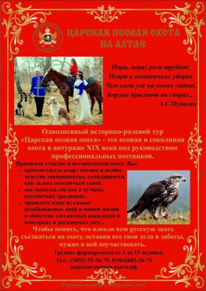 Только 19 СЕНТЯБРЯ - специальная цена на участие в проекте "Царская псовая охота" Торопитесь кол-во мест ограничено! Станьте одним из первых участников красивого захватывающего события Запись по тел. 53-36-75! Тур выходного дня на праздник "Открытие сезона охоты на Алтае" от туроператора "Охота"Однодневный историко-ролевой тур "Царская псовая охота".Впервые в Алтайском крае!19 сентября в окрестностях г. Белокуриха! Псовая и соколиная охота! Начало в 8:00 ч. Прием заявок на участие по тел. 53-36-75. Справки по тел. 53-36-75http://www.ohotka.ru/tours/czarskaya-psovaya-oxota.html