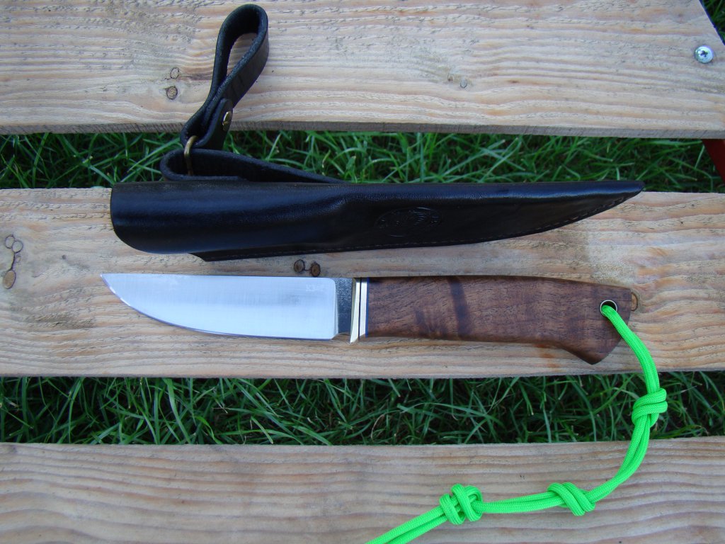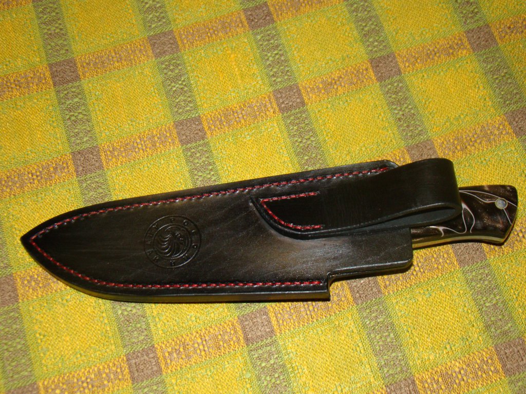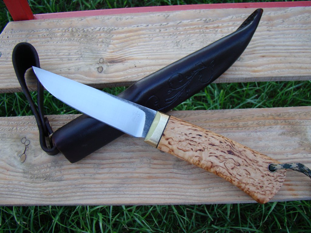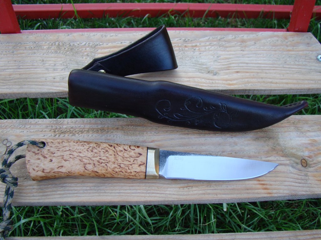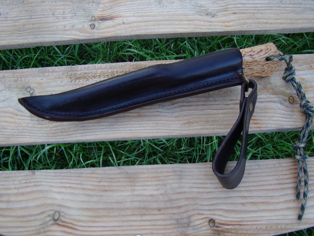 Австрийская сталь Bohler K340,рукоять карельская береза, ножны скандинавского типа с деревянным вкладышем кожа растительного дубления свободный подвес. 4500 т.р.