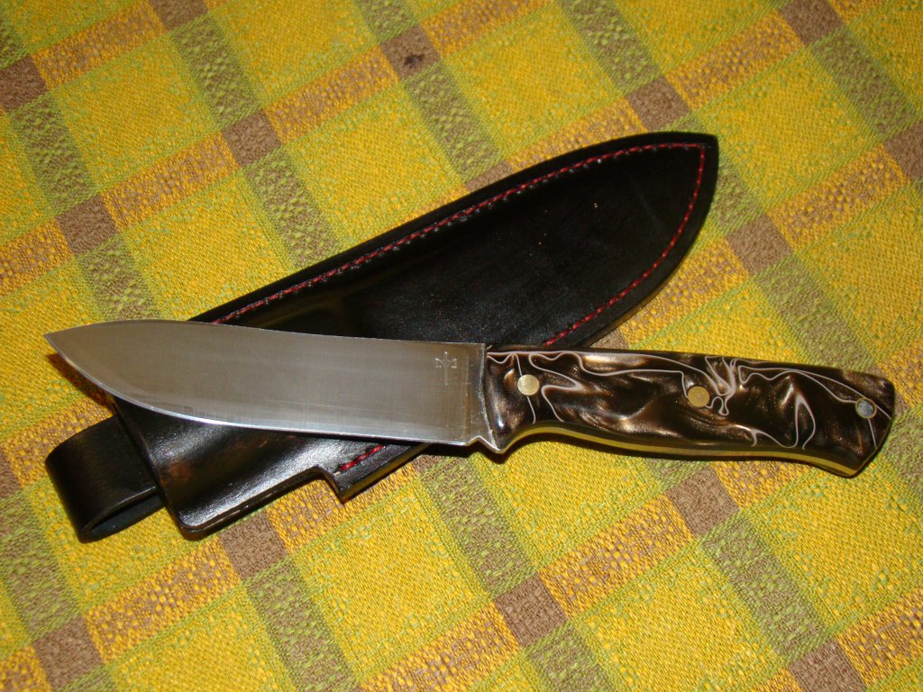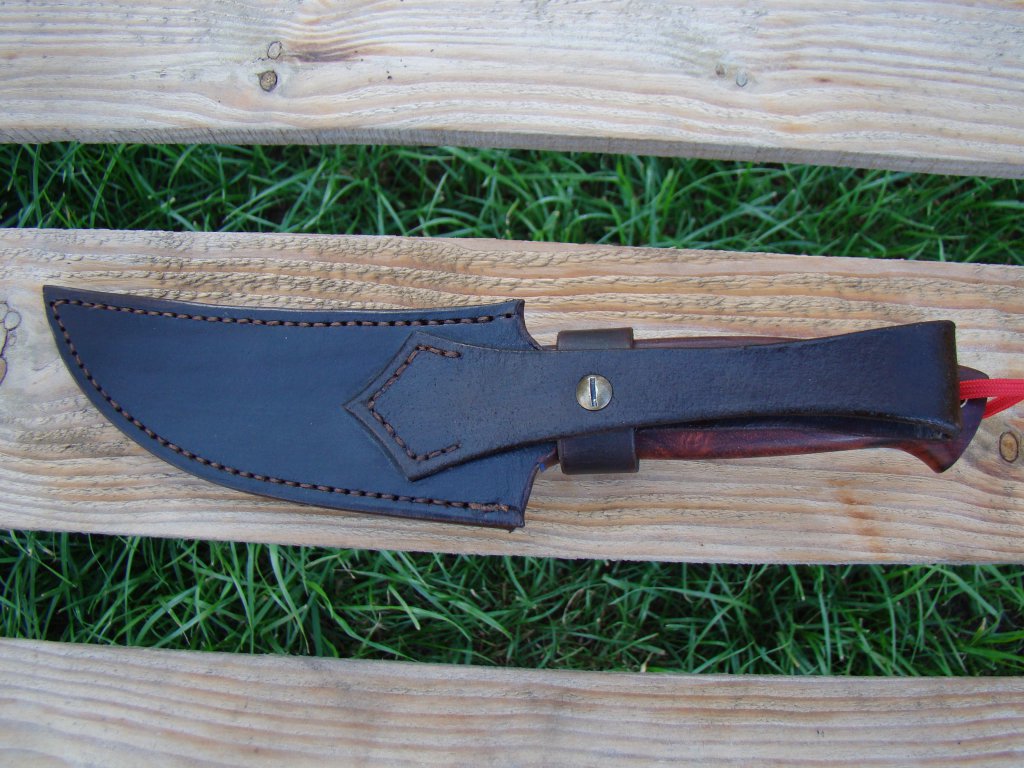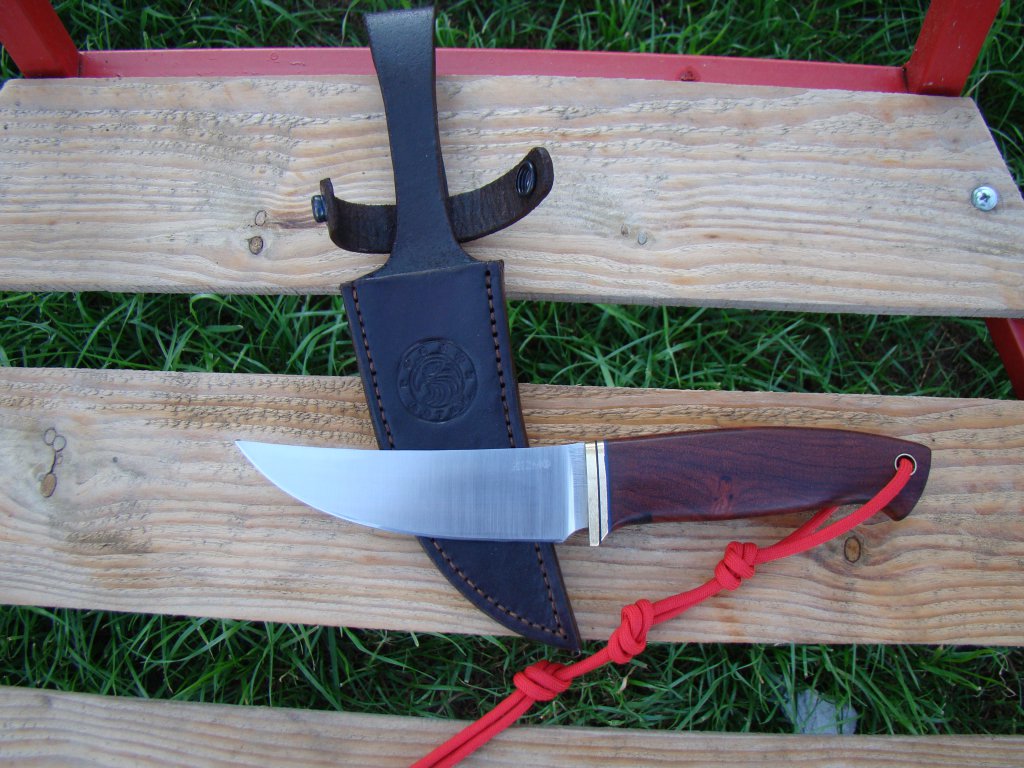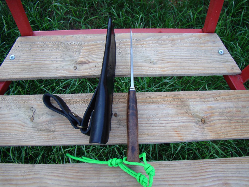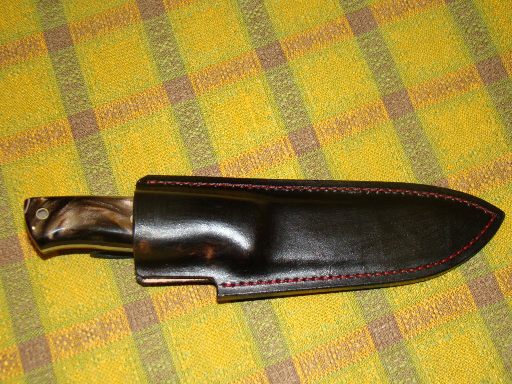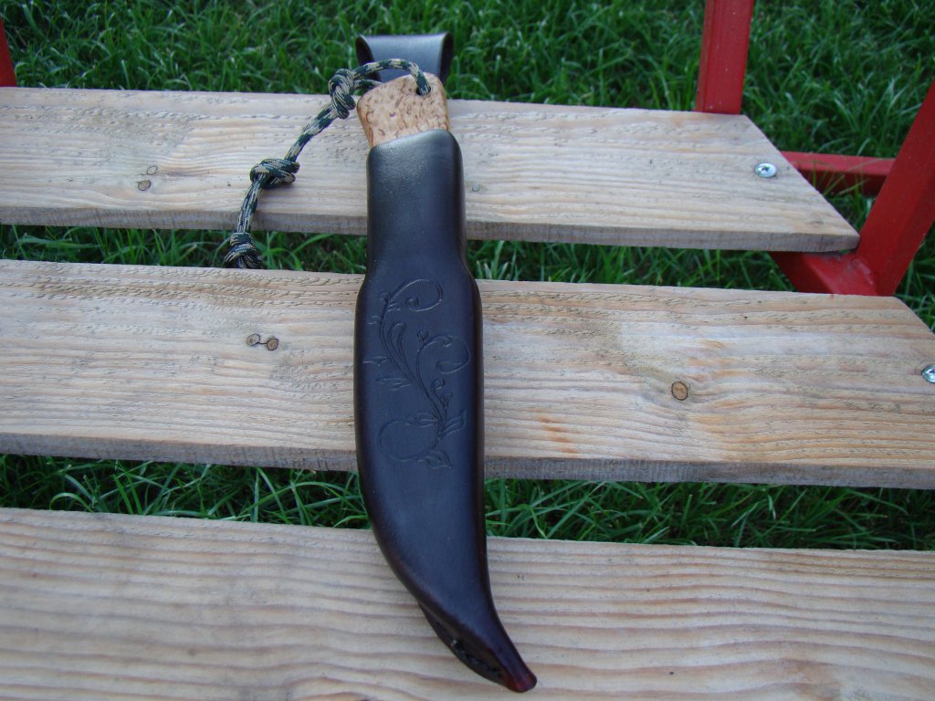 Австрийская сталь Bohler K340,рукоять карельская береза, ножны скандинавского типа с деревянным вкладышем кожа растительного дубления свободный подвес. 4500 т.р.