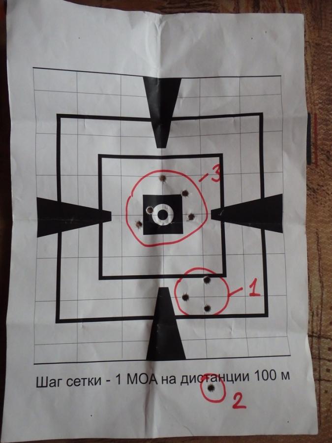 Сегодня ездил пристреливаться, на охоте пару раз на лыжах раз падал в снег карабином, думаю надо проверить оптику Вот мишенька: 1 - первые 3 выстрела со 100 метров, увидел что ниже пошло, решил 8 щелчков поднять,но покрутил не в ту сторону (то бишь вниз) и результат под цифрой 2. 2 - 4-й выстрел, ушло еще на 2 минуты ниже. Потом понял что крутил поправки не в ту сторону и вернул сначала на исходную, а потом еще 8 щелчков вверх. 3- серия из 5 выстрелов, результат видите сами . Патроны геко 3.6гр., стрелял со стола без всяких станков,т.к. у меня их нету Забыл,стрелял с оптики (переменник), на 9 крат стояло