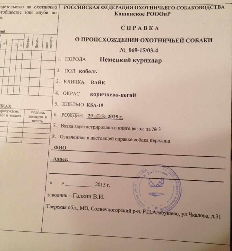 Кашинское ООиР предлагает щенков НЕМЕЦКОГО КУРЦХААРА. Известные проверенные рабочие крови, в т.ч. немецких v.Bockh?ft и v.d.Zista Рожд. 29.08.2015 г. Родилось 9 щенков: 3 суки и 6 кобелей коричнево-пегие в крапе. Мать: ЗП-Нордика, ВПКОС 495-ЗП-13/01-06 (на обмене), РКФ 1130385 Окрас коричнево-пегий в крапе Экстерьер Отлично Пол.дипл: 2-III б/д; II у; III к/с Плем.класс: Первый Владелец: Галкин В.И. Дед: ч.б. БЕКАС http://huntdogs.ru/dog_details.php?bc_tovar_id=3830 ИнтерЧемпион, Чемпион НКП, Чемп.России, Балкан, Болгарии, Сербии, Македонии, Черногории ВПКОС 3191/06, РКФ 1746268 Окрас коричн.-пегий в крапе Экстерьер Отлично, 7хСАСIВ Пол.дипл. 4-II, 5-IIIб/д; IIIбор/д.; I, 2-IIу; II, 2-IIIв/к; 2-II, IIIв/б; 2-IIк/с Плем.класс Элита, Чемпион Межрегиональной ВОС ВФСО «Динамо»-2010 Владелец: Мальченко В.П. Бабка: ч.НЕГА http://huntdogs.ru/users/my_dog_details.php?bc_tovar_id=4050 ВПКОС 3930/12, РКФ 2674495 Окрас коричневый Экстерьер Отлично Пол.дипл. II, III п/д; II, 4-III б/д; I, II ,3-IIIу; II, III к/с Плем.класс Элита, дважды Чемпион Межрегиональных выставок Владелец: Арзыев М.М. Отец: Барон Бернард фом Бокхофт Чемпион НКП, РКФ, России, Евразии. ВПКОС 3180/06, РКФ 1746266 Окрас коричнево-пегий в крапе Экстерьер Отлично Пол.дипл: II, III п/д; 2-II, III б/д; II у; II, III к/с; 2-I, 2-II , IIIв/б; 3-II, 4-III в/к Плем.класс: Элита Владелец: Горохов А.А. Дед: ч.,п.ч. СЛАЙД http://huntdogs.ru/dog_details.php?bc_tovar_id=1630 Кандидат в Интер Чемпионы Чемпион России Чемпион РФОС CACIB, 6 CAC, ЛТП Абсолютный полевой чемпион чемпионата континентальных легавых 2002 года. Призер Смоленских обласных состязаний по боровой дичи 2002 года. Призер ВПС по вольерному кабану 2002 года. ВПКОС 2655/01, РКФ 1214652 Окрас: коричн.-пегий в крапе Экстерьер: Отлично, Пол.дипл. 2-I, 2-IIб/д; II бор/д.; I, 2-IIв/к; I, 3-IIв/б; 3-I, II у; 2-IIк/с. Плем.класс Элита. Владелец: Тосенко С.А. Бабка: п.п. WANDA vom BOCKH?FT, Германия DPSZ, VDH, 1096/02 ВПКОС 2738/03, РКФ 1362808 Окрас: коричн.-пегий в крапе Экстерьер: Отлично Пол. дипл. 2-III б/д; II бор/д.; I, III в/к; II, IIIу; II в/б; IIк/с. Плем. класс: Элита Владелец: Тосенко С.А. Консультации по выращиванию, воспитанию, кормлению, натаске. Ответим на все вопросы. Приём на льготных условиях в школу натаски. Мы своих не бросаем! Цена 25-30 т.руб. тел. 8-916-660-69-02 Владимир, 8-916-184-91-96 Валерия