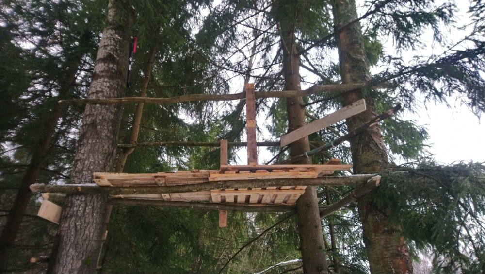 На одном дереве, с подпорками на искосок снизу, просто но на словах не объясню, надеюсь скоро поехать в ту сторону, сфотаю покажу. У меня на 5-ти метрах висит лобаз, правда маловат, по спать не развалишься. У меня знакомые избушку так сделали вокруг пихты здоровенной.