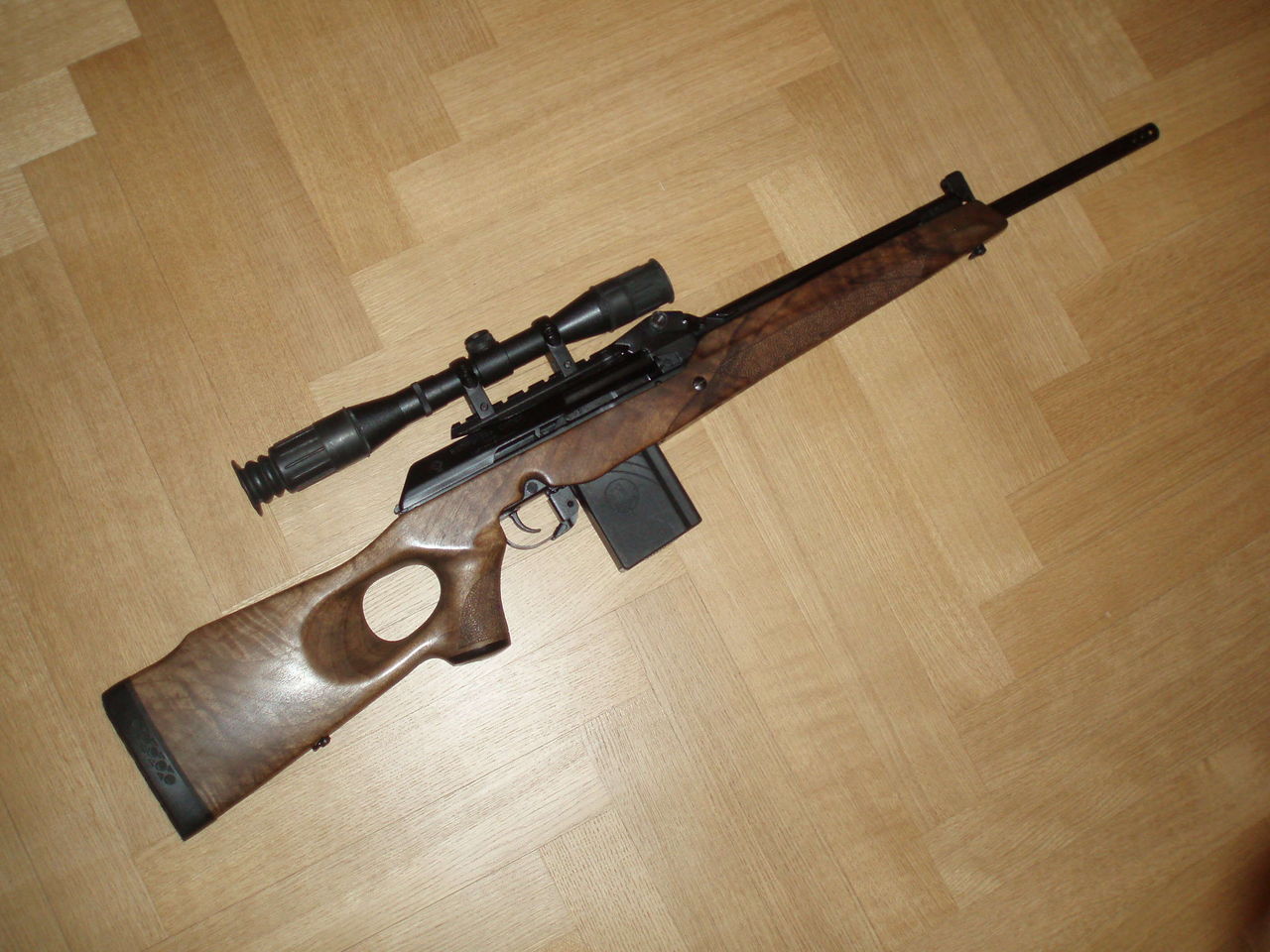 есть вепрь 308, 7.62х51 приклад и цевье - орех, длина ствола 710мм, пару раз ездил с ним на охоту. настрел выстрелов 100, лежит без дела.
