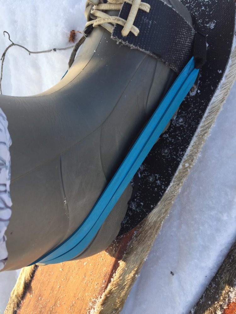 В целом лыжами очень доволен : устойчивость при ходьбе, спокойный подъем в пологие горки (ходил вдоль небольшой речки). Попал на участок, где гонялись снегоходчики, пришлось полазить по ямам-гребням. Поперек, конечно, не лез, но в целом, сомнений в прочности лыж при прохождении таких участков не возникало. Хорошо, что не последовал советам обработать камус силиконовой смазкой. Может, крепким-спортивным охотникам, кому надо накручивать километры на обходах это и пригодится. Но меня устроило скольжение "природного" камуса. При ходьбе по ровному месту не тормозит, а "коньковым ходом" идти задачи и не стоит. Под горку катишься не спеша, при необходимости можно ускориться переступанием или толчком палки. С моим проблемным суставом мне такая неспешность весьма по нраву. Обратил внимание, что лыжи охотнее идут по свежему снегу, чем по своему следу. С одной стороны, разница несущественная, с другой - может это проявление для конкретных погодных условий.