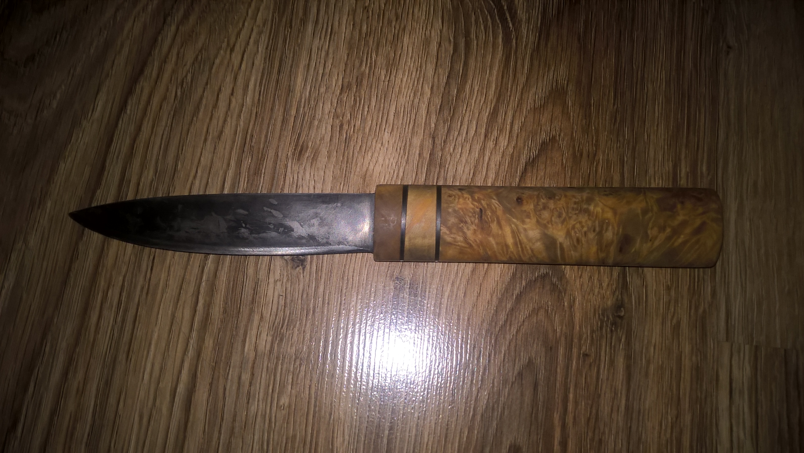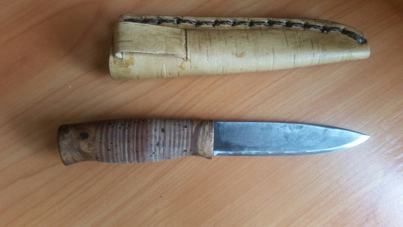 1. Сделан по эскизам охотничьего ножа Сабанеева Л.П. - Сталь высоко углеродистая У-10 - Форма клинка сведена на три клина, в обухе у рукоятки 5,2 мм с последующим сгоном к жалу на 3 мм, длинна 130 мм, ширина 28 мм; - Клинок имеет зонную закалку, лезвие твёрдостью не менее 62 единиц HRC. - Рукоятка выполнена из корневого капа с набранной берестой, без использования металла, имеет бочкообразную форму, на ощупь бархатистая в руке не скользит, на морозе не холодит, пропитана льняным маслом; -Ножны выполнены из бересты, погружного типа, прошиты кожаным шнуром. Цена 8000 рублей - 2 Якутский нож - Сталь высоко углеродистая У-10; - Форма клинка асимметричная, заточка односторонняя под правшу, форма спуска выпуклая линза, дол кованый в обухе 3,5 мм, длинна 125 мм, ширина 25 мм, твердость клинка 56-59 единиц HRC; - Рукоятка выполнена из берёзового капа, имеет яйцеобразную форму, длина 130 мм; - Ножны из бересты, погружного типа, прошиты вощённым шнуром; -Протестирован на КРС, обдирку с разделкой быка двухлетки выдержал без правки. Цена 6000 рублей Кому интересно пишите в Личку Sib.Valero@mail.ru