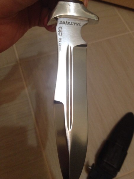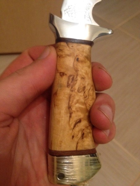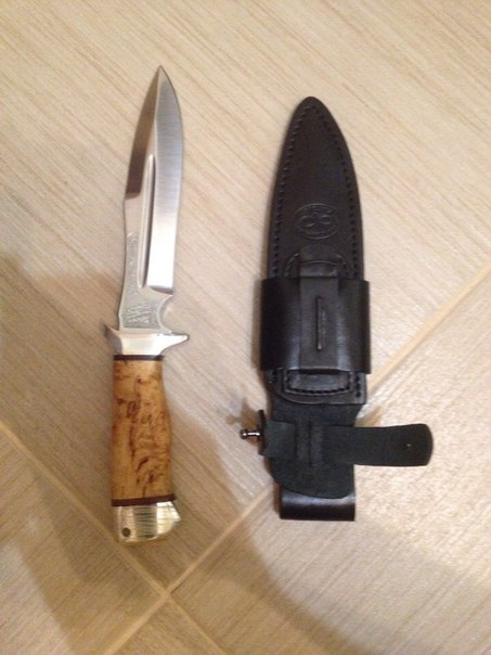 Затыльник и гарда алюминий. Рукоять карельская берёза. Кожаные ножны. Паспорт. Сертификат на нож.